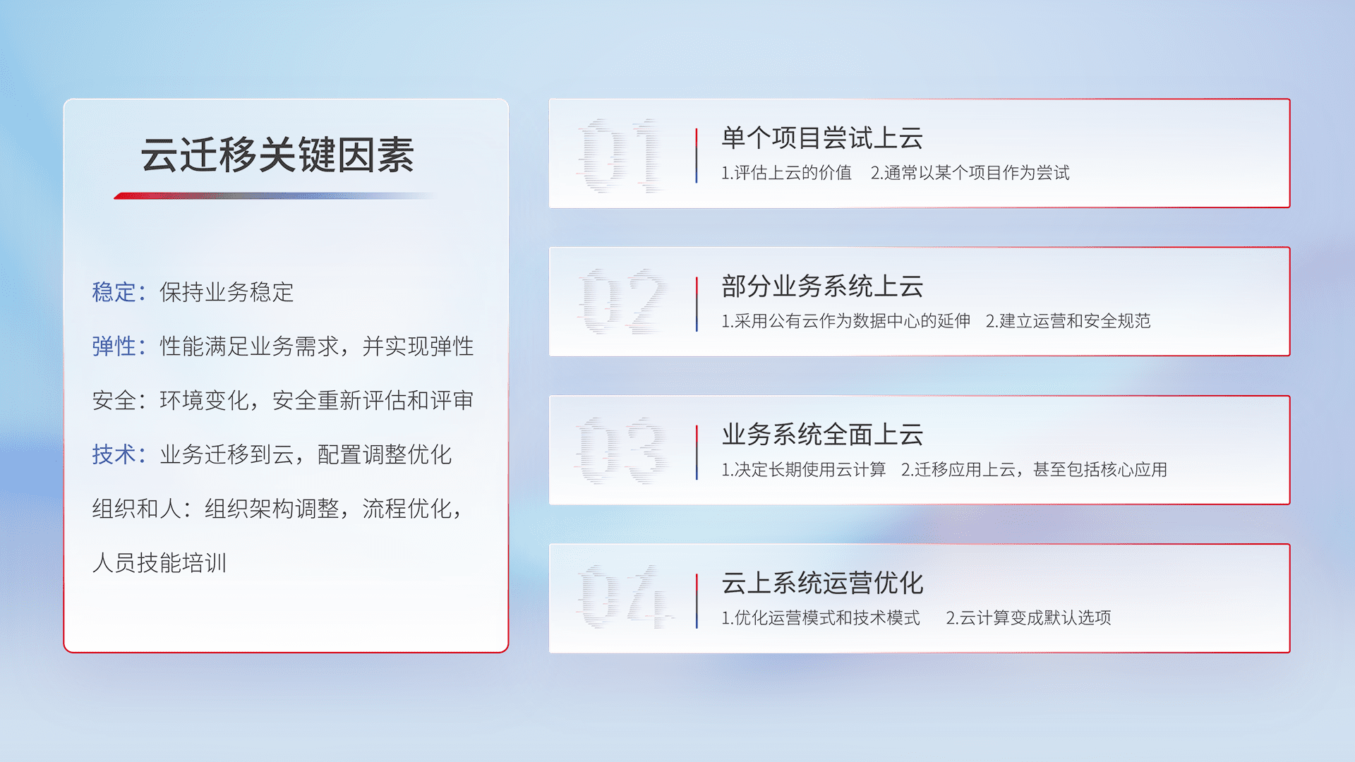 结合实际业务,,,从规划设计、、云平台选型、、云原生改造、、数据迁移、、、、集成交付,,迁移全过程为客户识别最佳上云路径,,做好风险识别管理,,设计网络架构、、、身份权限、、、、安全审计合规、、、操作审计、、、、日志审计、、监控告警策略、、、多站点容灾设计等,,,,对云上基础设施进行整体规划,,,提升IT治理水平,,以满足弹性、、、高可用、、高性能的需求。。。。