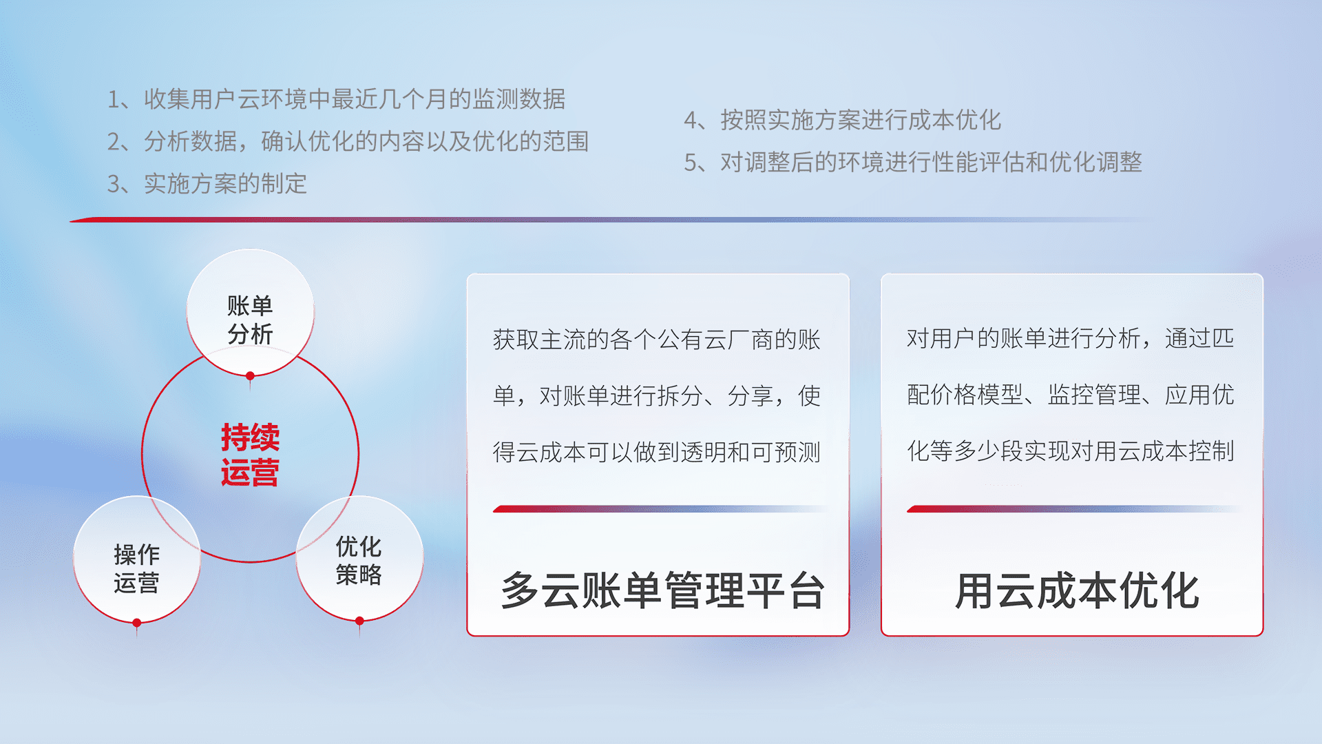 通过多云纳管,,以统一的资源数据模型把客户的云资源进行抽象和封装,,进而实现对多云资源的统一操作,,,保障云资源管理的可靠性、、、、稳定性与可用性。。量身定制化运维内容,,,,配置、、开发运维、、、补丁管理、、、备份、、、监控、、认证和访问管理、、、、审计和日常巡检等,,保障在用云过程中的可靠度,,稳定度以及高可用率。。