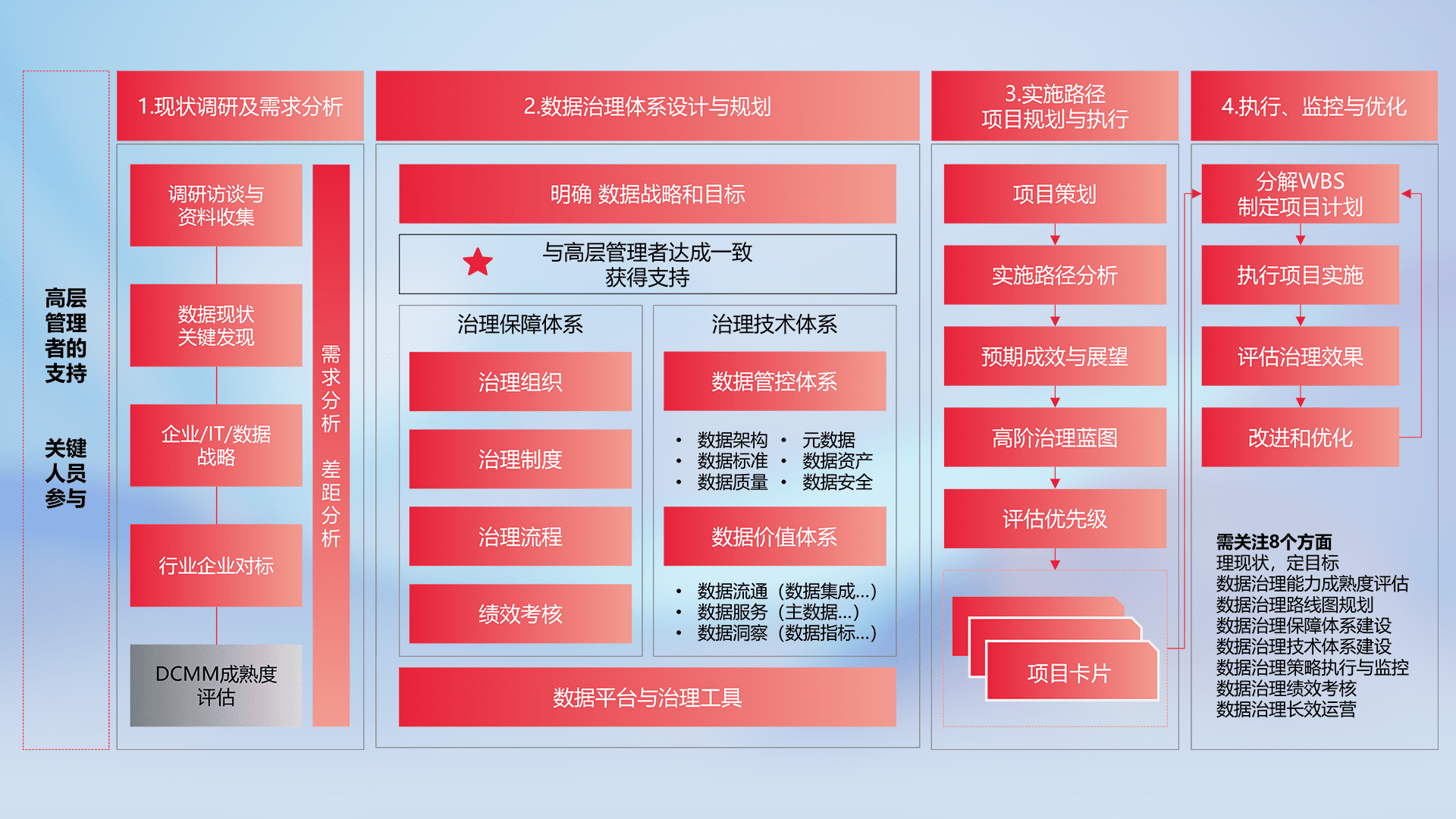 制定并执行统一的数据标准,,,,规范数据定义和格式,,,,消除冗余和不一致性,,实现跨部门和跨系统的数据一致性,,为企业提供标准化的数据基础。。